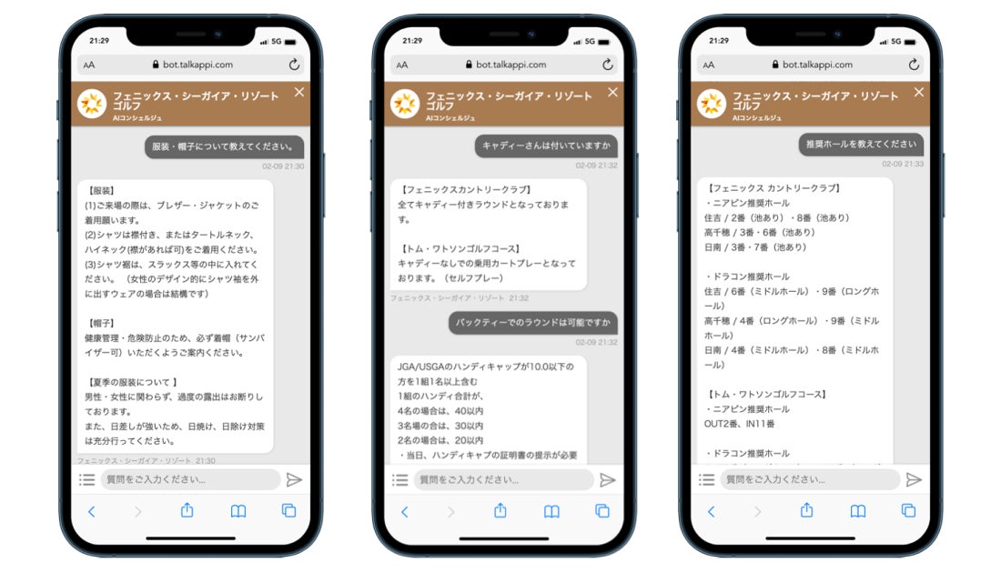 今回は、ゴルフ場特有の質問に対応できるようにゴルフページのユーザー導線にゴルフ場に特化した専用AIを適用いたしました。ゴルフ場の様々な案内をしつつ、リゾート全体の案内情報とも連携しており、操作上はシームレスな稼働となっております。