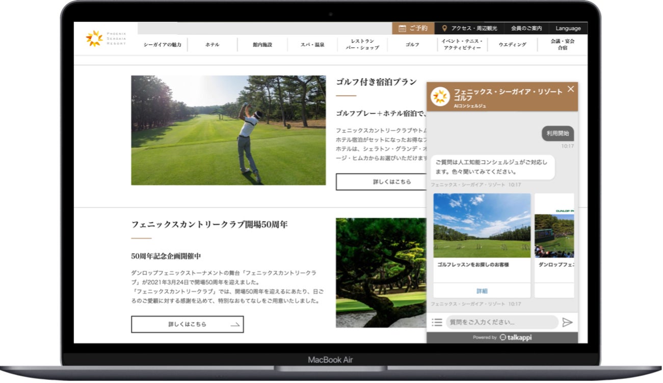 この度フェニックス・シーガイア・リゾート様に顧客体験プラットフォーム「talkappi」に含まれるサービス、多言語AIチャットボット(talkappi CHATBOT)とSaaS型FAQシステム(talkappi FAQ)を導入しました。